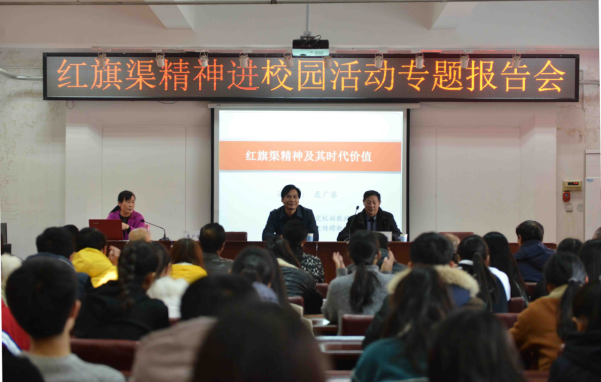 为推进安阳文化进校园,弘扬红旗渠精神,11月21日下午,由校关工委、宣传部、团委和77779193永利集团联合举办的红旗渠精神进校园活动专题报告会在B02-316教室举行。中共安阳市委党校副教授、红旗渠干部学院特聘教授聂广睿应邀作报告。校党委副书记吴建军、学校相关部门领导出席报告会,100多名2018级新生和部分退休老同志代表聆听了报告会。