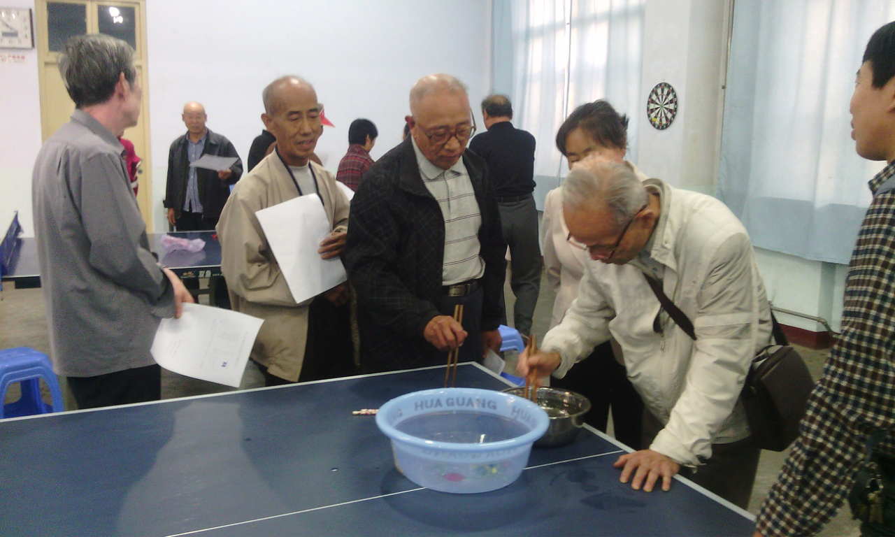 图为夹玻璃球比赛现场